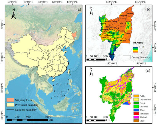 The SJP is located in northeastern China (Figure 2). It lies between longitude 130°13′~135°05′ E, and latitude 43°49′~48°27′ N, covering a total area of about 108,900 km2. The region has a temperate humid and semi-humid continental monsoon climate, with an average annual temperature of 2.5–3.6 °C and average annual precipitation of 500–650 mm, predominantly falling between June and September. Soil types primarily include black soil, planosol soil, meadow soil, and swamp soil, with the latter two being the most widely distributed [17]. With warm summers, simultaneous rain and heat, and fertile land, the area is particularly suitable for agricultural production and is a key national food production area, especially for rice cultivation. Paddy fields are being expanded to meet the growing demand for food, but such expansion often has far-reaching impacts on local natural ecosystems. Therefore, studying how paddy expansion affects ESs can provide a scientific basis for balancing food security and ecological protection.