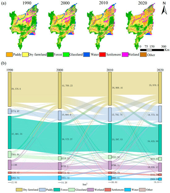 Throughout the study period, the areas of forest, grassland, wetland, and water exhibited a consistent decline, decreasing by 2.56%, 3.19%, 2.15%, and 1.03%, respectively, by 2020. The area of settlement decreased and then rose, resulting in an overall increase of 0.10%. The “other” category had the smallest proportion of the area and exhibited minimal change over the period. The rates of change for each land use types from 1990 to 2020, in descending order, were as follows: paddy fields, grasslands, drylands, forests, water, wetlands, settlements, and other categories.