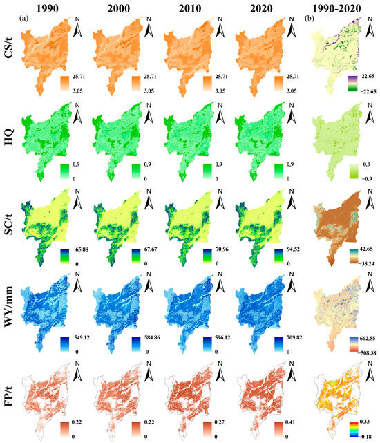 (a) Spatiotemporal distribution of ESs in the SJP from 1990 to 2020. (b) Spatiotemporal changes in ESs in the SJP.