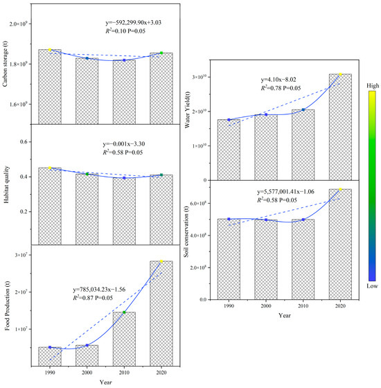 From 1990 to 2020, ESs in the SJP exhibited varying trends (Figure 5). CS, HQ, and SC initially showed decreases followed by increases, with CS decreasing by 0.01 × 109 t and HQ by 0.04. SC decreased from 1990 to 2010 and significantly increased from 2010 to 2020, resulting in SC increasing by 1.78 × 108 t over the 30 years. WY increased by 1.32 × 1010 t over 30 years. Grain production increased by 2.32 × 107 t over the last 30 years, attributed to the cultivation of improved varieties, the rational use of fertilizers and pesticides, and advancements in agricultural mechanization.