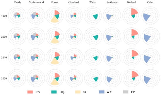 In this study, the mean ESs value for each land category was calculated separately using spatial statistics tools in ArcGIS10.6, and the ESs of each land category were normalized and plotted in a rose diagram (Figure 6). The results showed that forests and wetlands had the highest CS from 1990 to 2020, reaching 25.71 t and 19.68 t, respectively. Forests and water primarily provide regional HQ functions, and changes in HQ reveal significant decreasing trends for each category from 1990 to 2020. Forests and grasslands, as the largest regional providers of SC functions, exhibit fluctuating upward trends in their SC levels. WY is the most important ecosystem service for settlement and other land uses. FP activities are generally carried out only on cropland; thus, paddy fields and drylands contribute most significantly to regional FP functions. As the largest land use types in the SJP, paddy fields and drylands not only perform all five ESs functions, but also deliver relatively high levels of ESs. Grasslands, forests, and wetlands, as important ecological barriers in the region, also assume most of the ESs functions. Water, settlement, and other land uses, on the other hand, contribute relatively singular ESs functions.