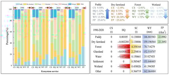 In terms of the proportion of ESs provided by each LUT in the SJP (Figure 7), paddy fields, drylands, and forests have strong ESs provisioning capacity, and the proportion of ESs provided by these three land use types consistently exceeds 50%. Overall, the proportion of ESs provided by each land use types in the SJP remained relatively stable from 1990 to 2020. Additionally, the ESs capacity of paddy fields increased during this period due to the expansion of paddy fields and the increase in grain production per unit area. Conversely, due to the implementation of the drought-to-water conversion policy, some of the dryland was converted to paddy land or other land types, resulting in a decreasing trend in CS, WY, and FP functions. Wetlands and forests exhibited a decreasing trend in all services except for WY, which increased. The ESs functions represented by each of the land classes changed over the 1990–2020 period, with CS remaining unchanged, while the other four services fluctuated. There was a small increase in HQ for paddy fields, and HQ services for all other land classes showed a constant or decreasing trend, while SC, WY, and FP services primarily exhibited increasing trends over the 30-year period.
