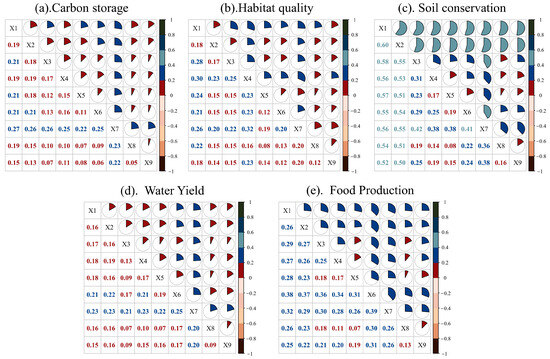Interactive detection of influencing factors of ESs in SJP. Note: X1, elevation; X2, slope; X3, annual precipitation; X4, annual mean temperature; X5, annual evapotranspiration; X6, normalized difference vegetation index; X7, soil type; X8, distance to river; X9, policy factors.