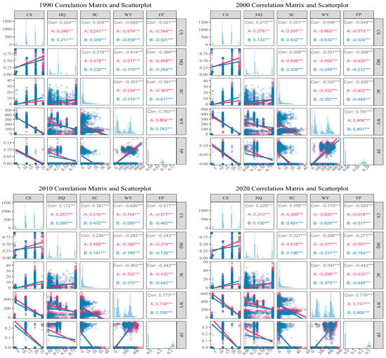 Correlation matrix and scatterplot of TOS of ESs in the SJP from 1990 to 2020. *** Indicating a highly significant p < 0.001. A, B represents the correlation demonstrated by dividing the data in the study area into two groups on average.