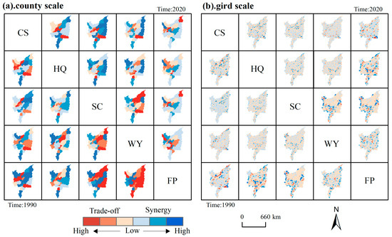 The areas of HQ and WY trade-offs are mainly clustered in the northwestern and southeastern counties and cities, while the synergy areas are scattered across a few counties and cities in the northeast and southwest. The TOS relationships between SC and WY are dominated by trade-offs, with the majority of the eastern part of the region characterized by trade-offs. In contrast, the TOS relationships between CS, HQ, SC, WY, and FP exhibit pronounced spatial heterogeneity. In 1990, the relationships among CS, HQ, and FP were predominantly synergies, whereas those among SC, WY, and FP were predominantly characterized by trade-offs. By 2020, weak trade-off relationships dominated most areas between CS, HQ, SC, WY, and FP. At the raster scale, the TOS relationships among the five ESs from 1990 to 2020, although differing in small regions, showed spatial similarities at a larger regional scale. In conclusion, the TOS relationships among ESs in the SJP exhibit significant scale effects as well as spatial heterogeneity.