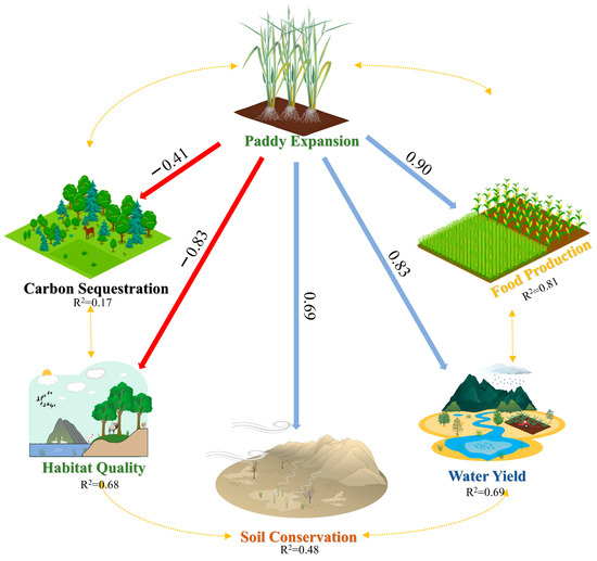 Although paddy field expansion promotes FP, it also affects regional ESs. We analyzed the effects of paddy field expansion on five ESs using the PLS-SEM model, and the results showed that paddy field expansion had a negative effect on CS and HQ, with coefficients of −0.409 and −0.827, respectively. Paddy field expansion directly contributed to SC, WY, and FP, with coefficients of 0.689, 0.828, and 0.898. Our study found that paddy field expansion leads to a reduction in the area of wetlands, forests, and grasslands, and that ecosystems such as wetlands and forests have high CS capacity. Converting these ecosystems to paddy fields reduces the vegetation cover and leads to a decrease in the regional CS. In addition, paddy field expansion can lead to the destruction of natural ecosystems such as wetlands and forests, reducing wildlife habitat and biodiversity, resulting in a decline in HQ [64]. Although paddy field expansion has a negative effect on CS and HQ, Paddy field expansion has a positive effect on the other three ESs. On the one hand, paddy farming can reduce soil erosion and improve soil retention through the root system of rice and soil moisture conditions. Irrigation systems and water management practices in paddy fields can increase WY in the region and promote water recycling. On the other hand, paddy field expansion directly increases the area under rice cultivation and enhances FP. In conclusion, paddy field expansion has had a complex impact on the ESs of the SJP, yielding both positive and negative effects.