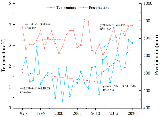 Changes in annual mean temperature and annual precipitation in the SJP from 1990 to 2020.