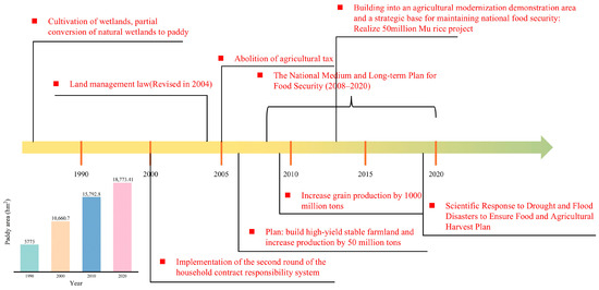 Over the past 30 years, the paddy field area in the SJP has expanded from 5775 km2 in 1990 to 18,773 km2 in 2020, nearly quadrupling in size. Some studies have shown that policy support plays a crucial role in promoting agricultural plantation restructuring [62]. Since the reclamation of the SJP, policy support has underpinned every large-scale expansion of paddy fields (Figure 13). Between 1956 and 1996, wetlands were primarily cultivated, and many were drained and converted into rice paddies. In the 21st century, a series of national policies and related laws have led to the implementation of strategies such as “curing floods with rice and enriching the people with rice.” Furthermore, projects such as “converting drought to water” and “converting wetland to water” have been executed [63]. Driven by food market prices, some farmers have spontaneously converted drylands into paddy fields. This series of initiatives has significantly facilitated the conversion of drylands into paddy fields.