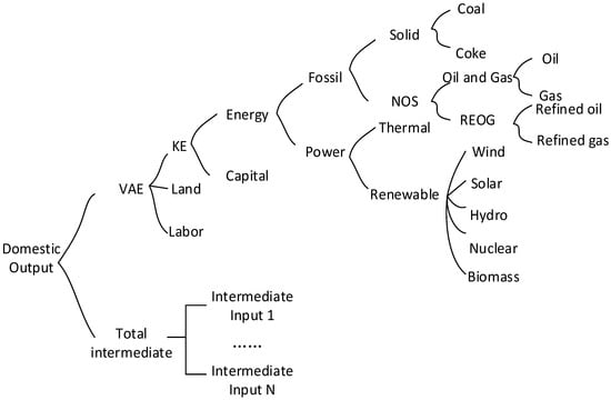 In the production module, this paper employs seven levels of nested production technologies (Figure 1), where Leontief’s production technology is treated as a synthetic intermediate input and all other input components are considered as CES production technologies. The model divides the input factors into labor, capital, and land and breaks down the agricultural sector into rice, wheat, corn, soybeans, potatoes, oilseed crops, cotton, sugar crops, vegetables, melons and fruits, other crops, forest products, livestock products, and fishery products, for a total of 14 subsectors. The energy sector consists of coal, oil, natural gas, refined oil, and refined natural gas, and the power sector includes five renewable energy subsectors: thermal and hydropower, wind power, nuclear power, solar power, and biomass power. Referring to CEEEA2.0, the model introduces a mechanism for firms to respond to energy price changes by spontaneously regulating production efficiency in response to energy–environmental policies and energy price shocks.