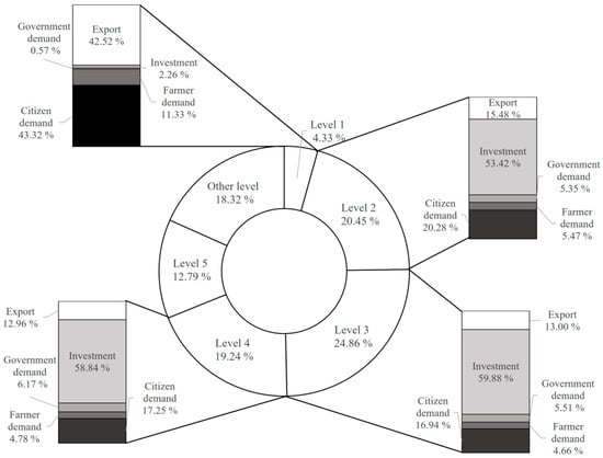 As can be seen in Figure 3, the contribution of agricultural GHG emission reduction at each production level is decomposed according to different demand types. More than 40% of the agricultural GHG reduction at production level 1 is due to citizen consumption and exports, suggesting that these two types of final consumption-induced GHG emissions are more likely to meet reduction targets.