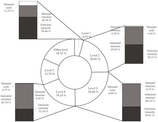Decomposition of emission reduction contributions and influencing factors at different production levels in the scenarios of emission reduction measures.