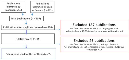 The PRISMA flow chart shows the selection process for the articles (Figure 1). Together, both searches identified 278 potentially relevant publications. After screening the titles and abstracts, 187 publications were excluded because they did not fall within the scope of the review (e.g., no comparison of ecological and conventional farming was made, and the study did not originate in the Czech Republic) (Figure 1). Ninety-one publications remained for full text screening, after which an additional 26 publications were excluded. Of the 65 publications that were included in the final selection, 58 were scientific articles, 6 were conference proceedings, and 1 was a book chapter (Figure 1, List of publication citations Supplementary Materials S1).