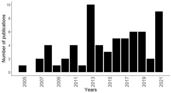 The data included in this study were published between 2005 and 2021 (Figure 2). Even though the maximum number of publications in one year was published in 2013 (10 publications), there was an increasing trend in the number of published comparisons of organic and conventional agriculture over the whole period covered by the search (Figure 2). With respect to the year the data were sampled, the oldest data used in the reviewed studies originated from 1996.