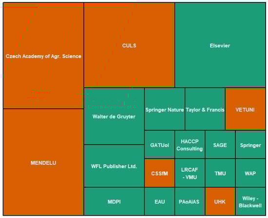 Tree map of publishers of publications included in the database (n = 65). The rectangles in orange represent publishers based in the Czech Republic, and those in green are from abroad. Acronyms: CSSfM = Czech Scientific Society for Mycology, CULS = Czech University of Life Sciences Prague, EA. U = Estonian Agricultural University, GATUoI = Gh. Asachi Technical University of Iasi, LRCAF—VMU = Lithuanian Research Centre for Agriculture and Forestry; Vytautas Magnus University, MDPI = Multidisciplinary Digital Publishing Institute, MENDELU = Mendel University of Agriculture and Forestry Brno, PAoAiAS = Pakistan Association of Advancement in Agricultural Sciences, TMU = Tarbiat Modares University, UHK = University of Hradec Kralove, VETUNI = University of Veterinary and Pharmaceutical Sciences, WAP = Wageningen Academic Publishers.