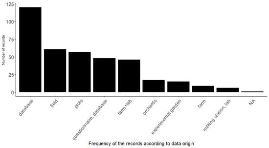 Individual publications varied in geographical scale—from the country-wide scale (mostly economic topics, n publications = 20) to the scale of a single location (hence only one study site; n = 12). Ten publications included two study sites, three publications included three sites, and 16 publications did not mention the number of study sites where data were collected. The types of data sources varied between the records (Figure 5) and included data extracted from databases (n records = 120), followed by original measurements made inside production fields (n = 61) or experimental plots (n = 57) (Figure 5).