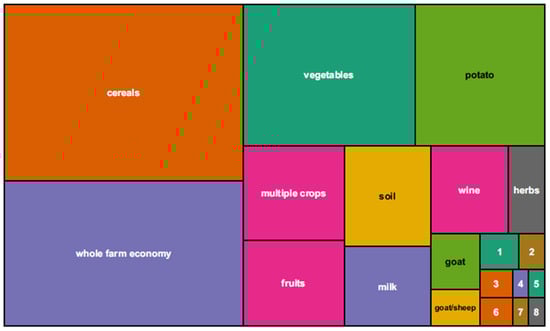 Tree map of keywords associated with the “Crop production” theme (n records = 204). The size of the smallest rectangle represents one record. 1—germination; 2—product weight; 3—product physical properties; 4—yield; 5—pesticide abandonment; 6—agrotechnical operations; 7—purity of seeds; 8—sensorial quality.