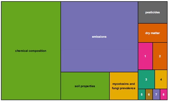 In the theme of “Crop production”, 15 different keywords were formulated (Figure 7). The main keywords included “chemical composition” in the final product (n = 73), “emissions” (n = 68) or “soil properties” (n = 17). Other keywords were linked to plant protection, such as “mycotoxin and fungal prevalence” (n = 10).