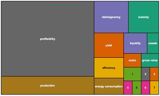 Tree map of keywords associated with the “Economy” theme (n = 122). The size of the smallest rectangle represents one record. 1—price of grain; 2—financial performance; 3—interest coverage; 4—ecological footprint; 5—economic size; 6—net value; 7—product chain.