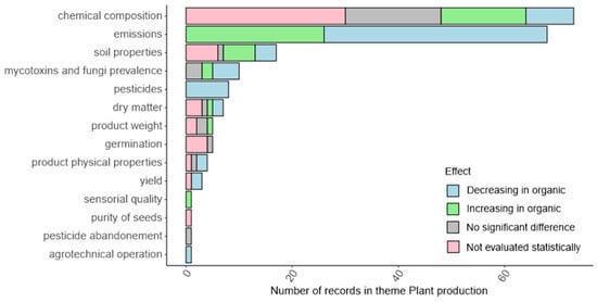 For the “Crop production” theme (n = 207 records), statistical analysis was absent from 48 records (23.2%). In 28 records, no significant effect of the cropping system was found; these insignificant records were largely associated with the chemical composition of the commodity (Figure 9). The main decreasing effect was found for the keyword “chemical composition”, which suggests that there were fewer compounds in organic farming than in conventional farming. The production of emissions differed according to the LCA analysis between the cropping systems, interestingly, in both directions. In 61.8% of the cases, the production of emissions increased, whereas in 38.2% of the cases, it decreased in organic compared with conventional farming (Figure 9). An increasing effect on soil properties was detected in six records (34.8%), a decreasing effect was detected in four records (23.2%), and no significant difference was detected in one record (5. 8%). The prevalence of mycotoxins and fungi decreased more often in organic farming than in conventional farming (Figure 9).