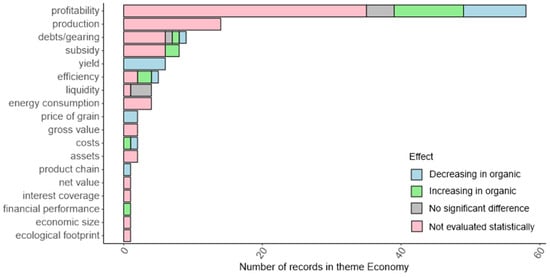 In the “Economy” theme, 76 out of 122 records (62.3%) did not provide any information about statistical analysis (Figure 10). Only keywords related to profitability and yield were statistically evaluated in a sufficient number of records. The effect of the farming system was equally divided into increases (n = 10) and decreases (n = 9) in the case of profitability; however, in four records, there was no significant effect (Figure 10). Only a decreasing effect on yield under organic farming was found (Figure 10).