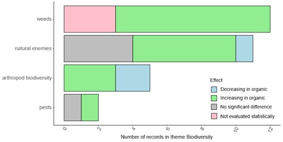 With respect to the “Biodiversity” theme, four keywords were identified (Figure 11). Weed abundance and diversity regularly increased in organic fields or plots (n = 9 out of 12), and the same patterns were also found for natural enemies (n = 6 out of 11) and other arthropods (n = 3 out of 5) (Figure 11).