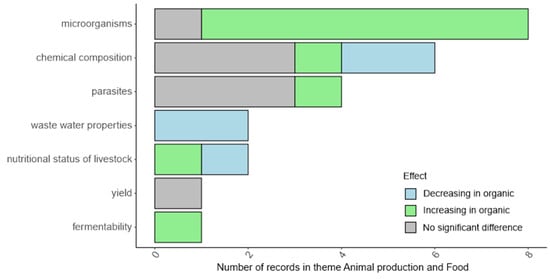 The themes of “Animal production” and “Food” were again considered together. Compared with conventional farming, organic farming more often resulted in a greater number of microorganisms in the final product (n = 7 out of 8) (Figure 12). Regarding the chemical composition, the observed effects were not conclusive (Figure 12).