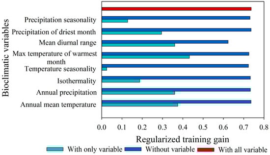 Many bioclimatic variables tend to increase the dimensionality of the ecological space due to high collinearity among bioclimatic variables [], leading to unfavorable model predictions. Thus, it is essential to screen the bioclimatic variables for this study. Firstly, the jackknife method was employed to evaluate the contribution percentage of 19 bioclimatic variables, and the variables with a contribution rate of less than 1% were removed. Secondly, the correlation coefficient was conducted by the ENMTools tool to reduce the effect of multiple contributions of bioclimatic variables on the MaxEnt model. Bioclimatic variables with high correlation coefficients (|r| ≥ 0.90) were removed. Finally, bioclimatic variables were screened based on the jackknife test and correlation analysis.