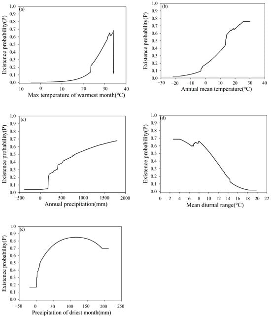 We selected the top five bioclimatic variables with high contribution rates to judge the relationship between distribution probability and bioclimatic variables (Figure 3). It was assumed that if the existence probability of sesame exceeded 0.5, the corresponding bioclimatic variables were suitable for plant growth [].