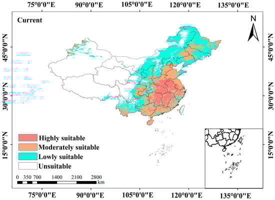 Figure 6 shows that the distribution of suitable areas had the same trend under the future climate scenarios compared with the current climate scenario. The area of total suitable areas ranged from 448.31 × 104 km2 to 477.49 × 104 km2, accounting for 46.51–49.54% of China’s total land area. The area of highly suitable areas, moderately suitable areas, lowly suitable areas, and unsuitable areas ranged from 60.05 × 104–71.92 × 104 km2, 129.43 × 104–167.65 × 104 km2, 237.17 × 104–270.88 × 104 km2, 486.39 × 104–515.56 × 104 km2, respectively.