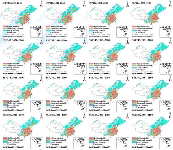No significant difference in the distribution of suitable areas under future climate scenarios compared to the current climate scenario. Furthermore, under SSP126 in 2021–2040, 2041–2060, 2061–2080, and 2081–2100, the area of highly suitable areas accounted for 6.84%, 6.26%, 6.97%, and 6.79% of China’s total land area, as well as accounting for 6.83%, 6.75%, 6.70%, and 7.04% under SSP245, accounting for 6.23%, 6.75%, 7.06%, and 7.46% under SSP370, accounting for 6.73%, 6.70%, 6.85%, and 6.58% under SSP585.
