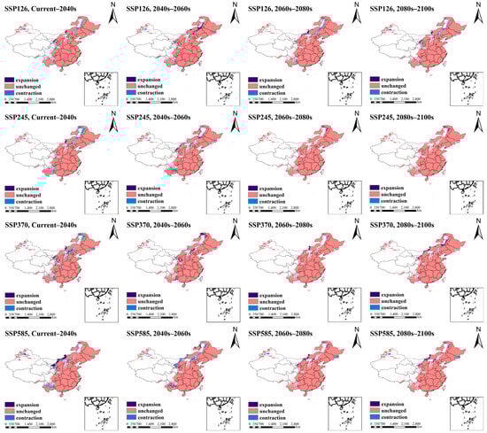 Under SSP370, the potential distribution of sesame presented an overall contraction trend in the current–2040s and 2060s–2080s, the area of suitable areas shrank by 38.74 × 104 km2 (4.02%) and 10.46 × 104 km2 (1.09%), respectively, which mainly concentrated in eastern Inner Mongolia, eastern Gansu, and eastern Yunnan. However, the area of suitable areas in the 2040s–2060s and 2080s–2100s expanded by 2.36% and 2.06%, comprising 22.75 × 104 km2 and 19.85 × 104 km2, where mainly concentrated in eastern Inner Mongolia, eastern Gansu, and eastern Yunnan.