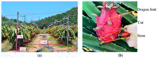 Dragon fruit cultivation areas are generally located on flat terrain. As shown in Figure 1a, in Hainan, dragon fruit cultivation commonly adopts a single ridge, single row, and close-planting cultivation mode to ensure uniform light exposure on both sides of the fruit. Steel cables connect the stakes in rows to support the branches, with dragon fruit stems usually attaching to the steel cables at a height of approximately 1.5 m above the ground. To minimize nutrient consumption and prevent ground-borne pests from spreading to the branches and fruit, the stems are pruned to maintain a height of at least 0.3 m above the ground. Therefore, dragon fruit generally grows within a height range of 0.3 m to 1.5 m, with row spacing between 2 and 3 m.