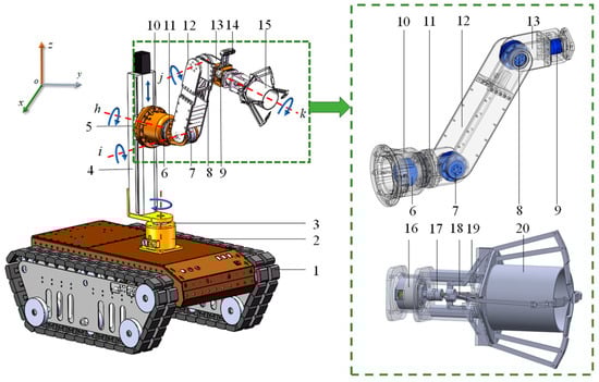 Dragon fruit picking robot joint motion directions and three-dimensional structure diagram. 1. Tracked chassis; 2. Manipulator base; 3. Joint 1; 4. Link 1; 5. Joint 2; 6. Joint 3; 7. Joint 4; 8. Joint 5; 9. Joint 6; 10. Link 2; 11. Link 3; 12. Link 4; 13. Link 5; 14. Vision system; 15. End effector; 16. Motor; 17. Coupling; 18. Screw mechanism; 19. Linkage mechanism; 20. Picking bucket.