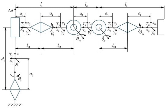where , , (i = 1, 3, 4, 5, 6) is the rotation angle of each link, and is the displacement of the second link on the lifting platform.