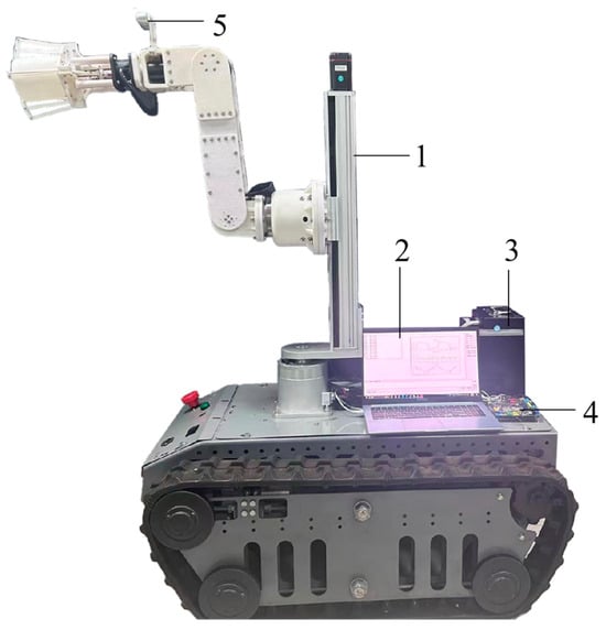 Schematic diagram of the manipulator. 1. Robot body; 2. Host computer; 3. 36 V lithium-ion battery; 4. Lower level controller; 5. Depth camera.