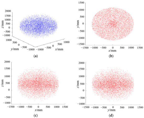 Based on the kinematic equations, a model for the dragon fruit picking manipulator was established, and Monte Carlo simulation was used for motion space simulation. The simulation results are shown in Figure 6, indicating that the workspace of the manipulator ranged from −1100 to 1100 mm in the x-direction, −1100 to 1100 mm in the y-direction, and −700 to 1600 mm in the z-direction. Since the zero point of the z-axis is set at the base, and considering the height of the base is 580 mm above the ground, the robotic manipulator can operate within a vertical space of 0 to 2180 mm.