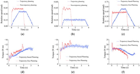 Joint 4 velocity and torque curves for each stage. (a) The p1 stage rotational speed; (b) The p2 stage rotational speed; (c) The p3 stage rotational speed; (d) The p1 stage torque; (e) The p2 stage torque; (f) The p3 stage torque.