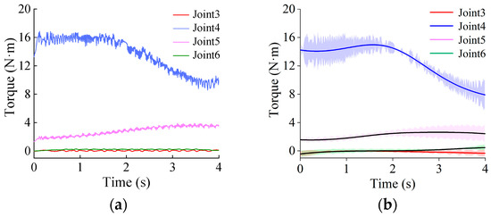 To validate the dynamics model, MATLAB R2023b was used to perform simulations under trajectory planning conditions. These simulations were compared with torque data obtained from the motion characteristics experimental platform. To ensure comprehensive data observation and recording for more accurate subsequent analysis, this experiment focused on the longest motion process, the p3 stage. It involved the simulation and testing of Joint 3 to Joint 6, as shown in Figure 9.