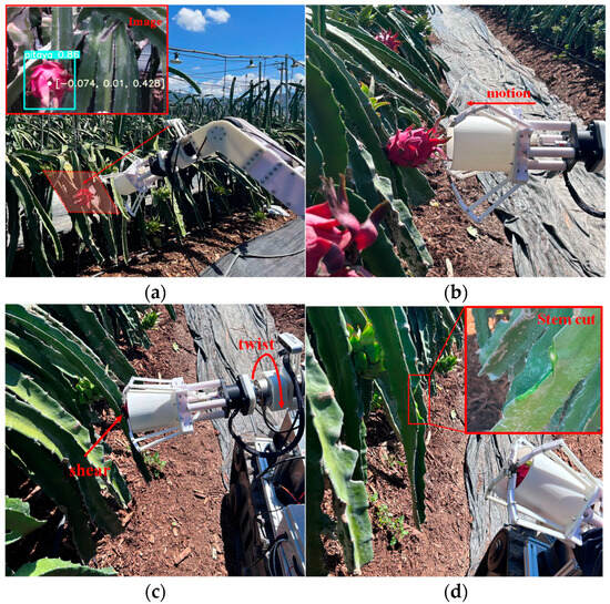Field testing of dragon fruit picking robot. (a) Object recognition; (b) Moving towards the picking position; (c) Shearing and twisting; (d) Fruit picking.