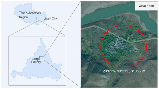 Soil samples were collected at Xiluo Farm in Lang County, Linzhi City, Tibet Autonomous Region, China (29°01′ N, 93°21′ E, 3105.2 m above sea level). Two sampling plots were randomly selected within the farm: one with natural soil (NS) and another under grazing Tibetan pig management (GS) (Figure 1). All samples were collected at depths of 0 cm, 10 cm, and 20 cm, with four random sampling points at each depth. The sample collection methods followed the national standard (GB/T 36197-2018 [10]). All collected soils were from the same geographical environment—sharing the same altitude, temperature, and humidity conditions—and were then passed through a 2 mm pore-size sieve. Immediately after collection, the samples were sealed and stored at 4 °C. Upon returning to the laboratory, they were stored at −80 °C until analysis.