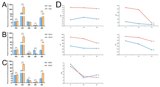 Changes in physical and chemical properties of soil in different soil layers. (A) The depth of the soil is 0 cm. (B) The depth of the soil is 10 cm. (C) The depth of the soil is 20 cm. (D) Line chart of content change in physical and chemical properties in different soil layers. * p < 0.05; *** p < 0.001.