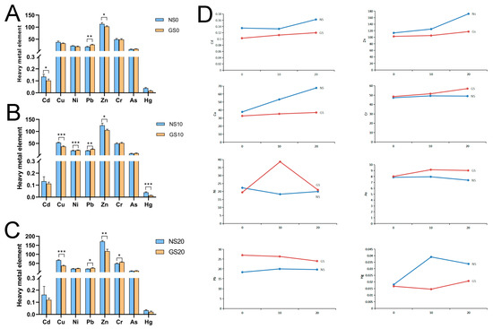 Changes in heavy metal content in soil. (A) The depth of the soil is 0 cm. (B) The depth of the soil is 10 cm. (C) The depth of the soil is 20 cm. (D) Line chart of heavy metal content change in different soil layers. * p < 0.05; ** p < 0.01; *** p < 0.001.