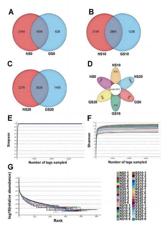 In this study, we sequenced amplicons from six treated soil samples and obtained a total of 4637,316 (NS0 = 764,176; NS10 = 726,251; NS20 = 798,240; GS0 = 788,063; GS10 = 778,581; GS20 = 782,005) raw sequences. After sequence optimization, we obtained a total of 4,149,517 (NS0 = 674,265; NS10 = 650,950; NS20 = 718,601; GS0 = 697,781; GS10 = 696,831; GS20 = 711,089) valid sequences with 81,663~127,501 sequences per sample (Table S1). After classification assignment, the valid sequences were clustered into 5083 OTUs based on 97% sequence similarity, with 326~1047 sequences per sample. In addition, 1011 core OTUs were observed (Figure 4D), representing approximately 19.89% of the total OTUs identified. Specifically, 3998 and 2462 OTUs were observed in NS0 and GS0, respectively, for a total of 1834 OTUs (Figure 4A). In NS10 and GS10, 5025 and 4129 OTUs were observed, respectively, for a total of 2891 OTUs (Figure 4B). In NS20 and GS20, 5304 and 4483 OTUs were observed, respectively, for a total of 3028 OTUs (Figure 4C). The Shannon and Simpson dilution curves in each sample flattened out and showed a trend towards saturation, indicating that the sequencing depth and number were sufficient for almost all bacteria to be covered (Figure 4E,F). In addition, the rank abundance curves span progressively wider in the horizontal direction and flatten out in the vertical direction, showing a slow downward trend, indicating excellent sequence abundance and homogeneity (Figure 4G).
