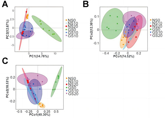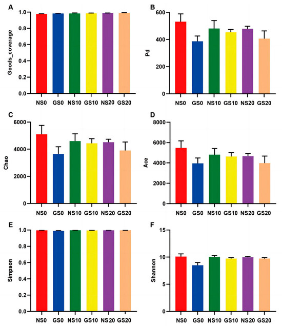 Microbial richness as well as diversity could be assessed using multiple alpha diversity indices (Good’s Coverage, PD, Chao1, ACE, Simpson, and Shannon) (Figure 5A–F). Good’s Coverage was approximately 99% across all samples, indicating that almost all bacterial species were found in sequenced samples with sufficient coverage. NS0 compared to GS0, Chao1 (5103.75 ± 651.53 vs. 3643.12 ± 538.97; p = 0.0019), ACE (5468.49 ± 701.73 vs. 3956.27 ± 532.38; p = 0.0021), PD (531.9358 ± 57.4144 vs. 386.9015 ± 39.4783; p = 0.0007), Shannon (10.1112 ± 0.5012 vs. 8.5092 ± 0.5090; p = 0.0003), and Simpson (0.9962 ± 0.0019 vs. 0.9889 ± 0.0038; p = 0.0039) all had decreased and highly significant (p < 0.05 for significant, p < 0.01 for highly significant) differences in the values of each parameter, indicating highly significant differences in the richness and diversity of the soil microbial communities between NS0 and GS0. The GS10 group showed a decrease and significant difference in values compared to NS10 on Simpson (0.9969 ± 0.0008 vs. 0.9949 ± 0.0019; p = 0.0489). This indicates a significant difference in soil microbial diversity between NS10 and GS10. NS20 and GS20 showed decreased and significantly different values on Shannon (9.9821 ± 0.1645 vs. 9.7321 ± 0.2064; p = 0.0439) and PD (479.4006 ± 18.6434 vs. 454.2679 ± 57.5423; p = 0.0253) showed decreasing and significantly different values, indicating significant differences in the diversity of soil microbial communities between NS20 and GS20. On the other hand, we observed that NS0, NS10, and NS20 were not significantly different on the statistical tests of Chao1 (p = 0.0550), Shannon (p = 0.3429), Simpson (p = 0.9599), and PD (p = 0.1129), indicating that there was no significant difference in the abundance and diversity of the natural soil microbiota. However, among these parameters, GS0, GS10, and GS20 were significantly different (PChao1 = 0.0464; PShannon = 0.0034; PSimpson = 0.0017; PPD = 0.0133), indicating significant differences in the abundance and diversity of soil microbial communities under the grazing Tibetan pig model.