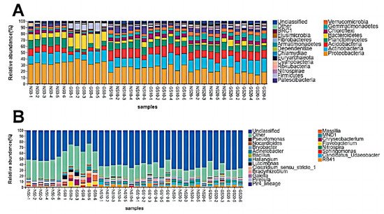 Stacked maps of the relative abundance of soil microbiota at the phylum and genus levels. (A,B) represent taxon assignments at the phylum and genus levels, respectively.