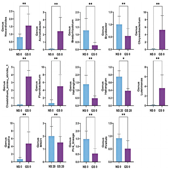 Differences in soil microbiota abundance between groups at the genus level. Results were assessed by one-way ANOVA. All data are expressed as mean ± SD. * p < 0.05, ** p < 0.01.