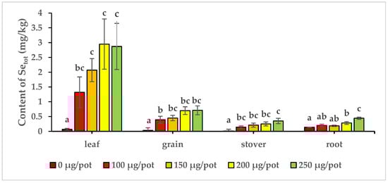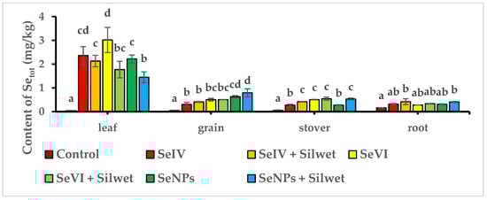 Total selenium content in parts of maize after application of different Se forms. Different lowercase letters indicate statistically significant differences among the treatments by a one-way analysis of variance (p < 0.05, n = 4).
