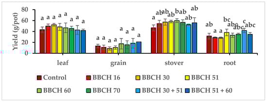 Yields of maize parts after the application of Se in different phenological phases. Different lowercase letters indicate statistically significant differences among the treatments by a one-way analysis of variance (p < 0.05, n = 4).