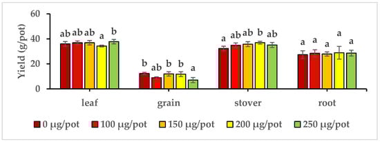 Yields of maize (Zea mays L.) parts after the application of different Se concentrations. Different lowercase letters indicate statistically significant differences among the treatments according to a one-way analysis of variance (p < 0.05, n = 4).