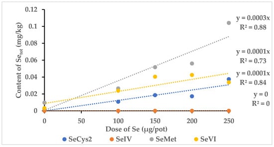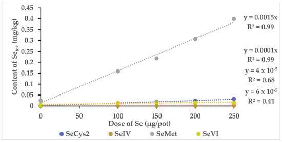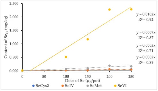When stepwise rates of sodium selenate were administered, a linear trend of increasing Se content, where a similar response for all the Se species was expected (Figure 7).